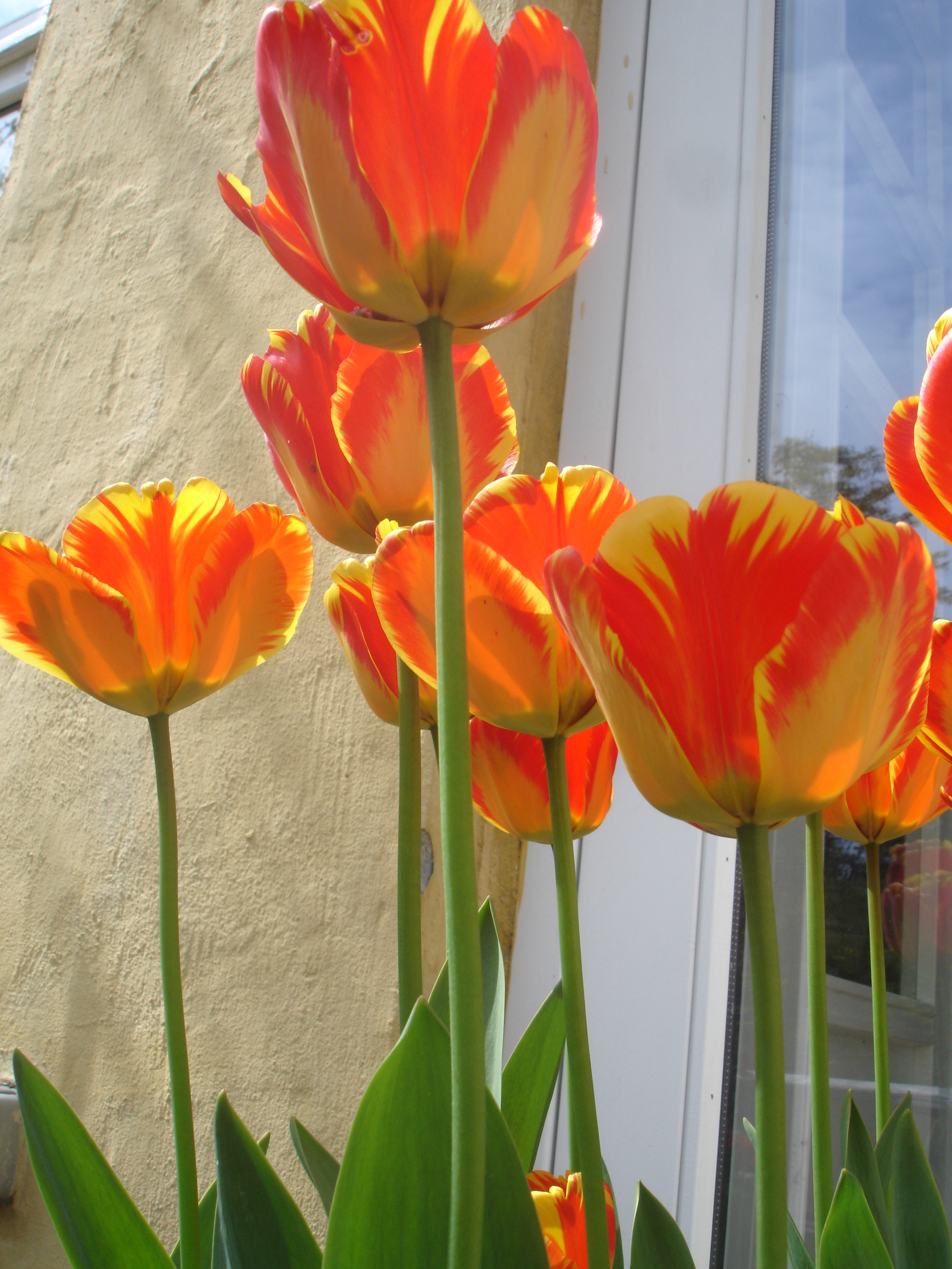 I believe the variety is called “Jet fire” which seems highly appropriate. I had never really appreciated tulips until a few years ago when we planted some “queen of the night” – dramatic dark purple flowers that really caught your attention, especially when combined with vivid orange tulips; the glaucous foliage of both setting off the combination beautifully.