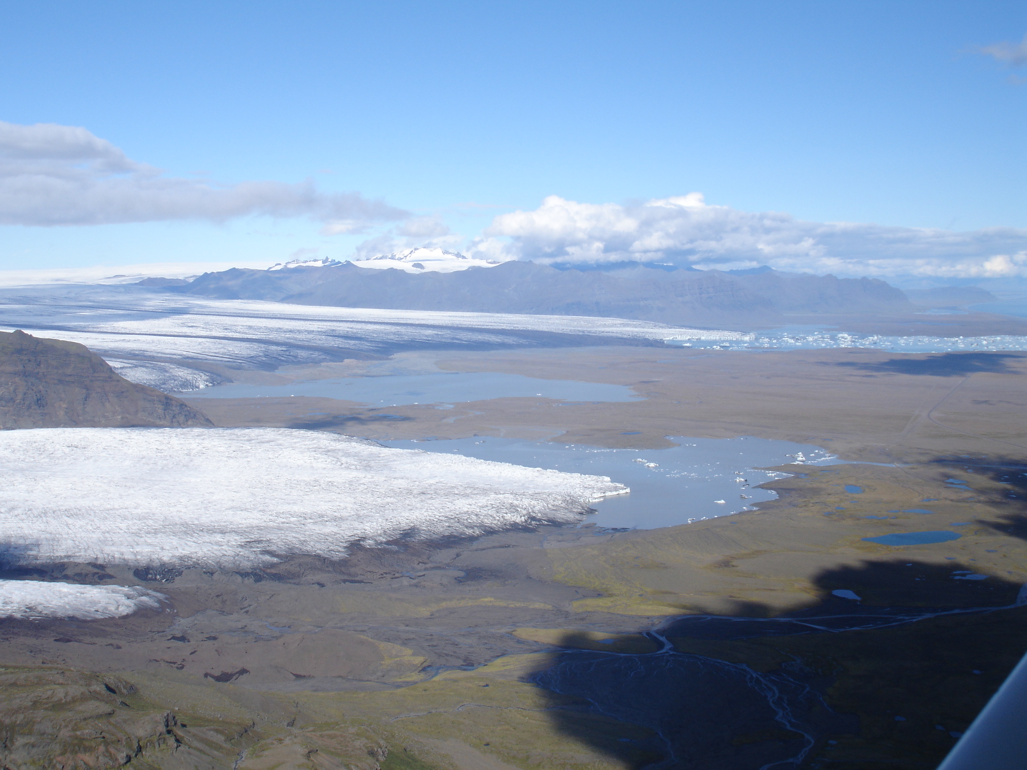 The photo below was taken in 2005 at the end of my last field season in Iceland. As a final farewell we took a plane flight over the glacier. In retrospect I wish I’d done it at the start as many processes and features we’d puzzled over became clear when viewed from above.
