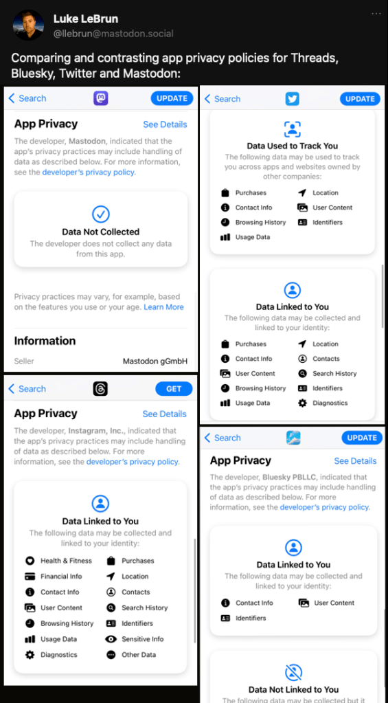 Thanks to mastodon user @micron for this image showing just how much data you hand over access to on different services.