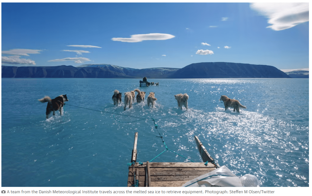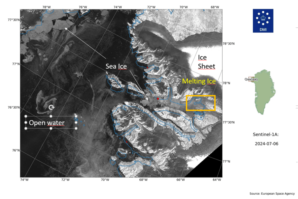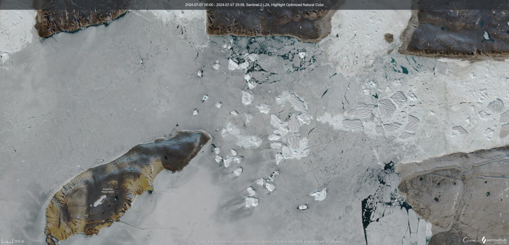 The latest satellite images look like the ice has already broken up into large flakes close to Qaanaaq. I’ve annotated the Sentinel-1 image below as it is from a radar satellite that can see through clouds and the images can be a bit confusing if you’re not used to looking at them.