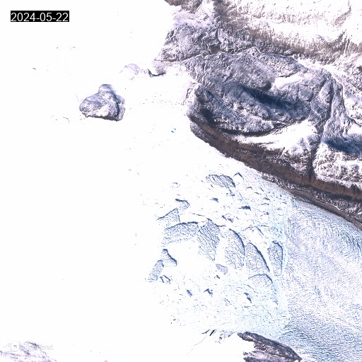 Animated gif of satellite images showing the front of Heilprin glacier with icebergs and landfast sea ice.