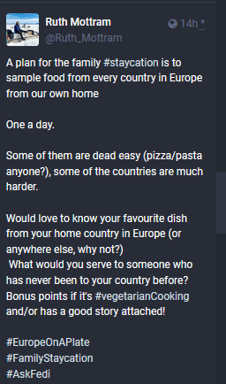 A particular favourite was the response from Ali Clarke to check out Ruth Salter’s #CookTheCup which is a dish for each country competing in the European championships this year and helpfully has allowed me to fill out a few countries I knew nothing about and have yet to have any responses from.