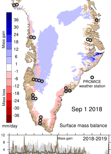 We use the output from the HARMONIE-AROME weather forecasting model to work out what the daily surface mass balance of the Greenland ice sheet is. This is then accumulated over the course of a mass balance year and the total gives an idea how healthy the ice sheet has it. Over the last few years we have also made a summary that is published on the excellent Carbon Brief website, here for example, is 2017.